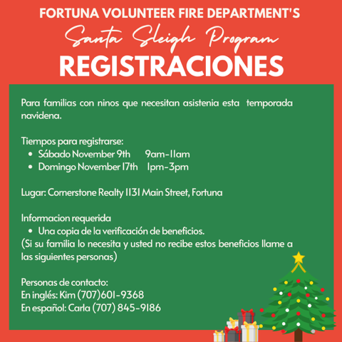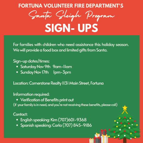 Fortuna Volunteer Fire Department Santa's Sleigh Program Sign-Ups: Nov. 9 at 9 AM-11AM and Nov. 17 at 1 PM - 3 PM
